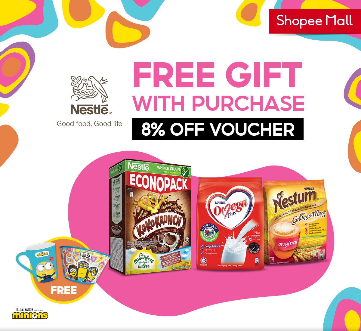 只要从即日起在 Nestle 官方 Shopee 网店购买指定商品就能免费获得指定的限量版 Minion 周边商品。Minion 周边商品其中包括了 毛巾、碗、保温袋和马克杯,每个赠品都非常实用也非常值得收藏起来!